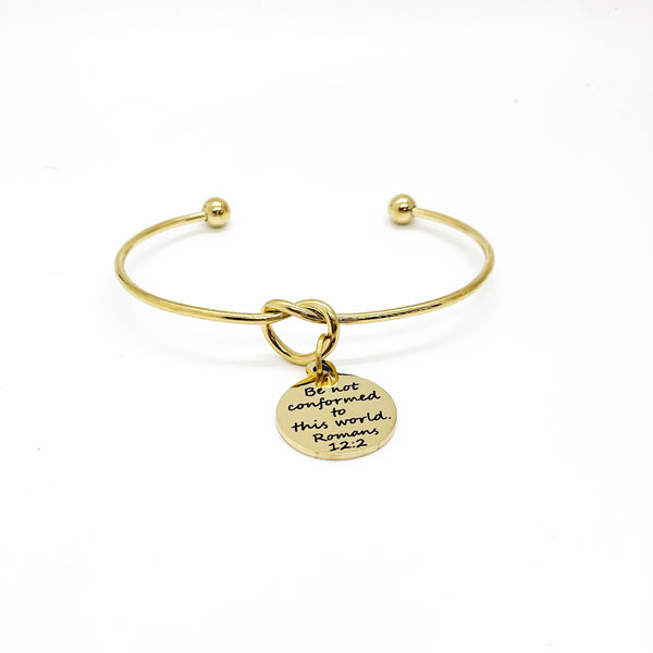 This is a beautiful gold-plated knot bracelet with a laser engraved charm with “Be not conformed to the world” from Romans 12:2 on it.