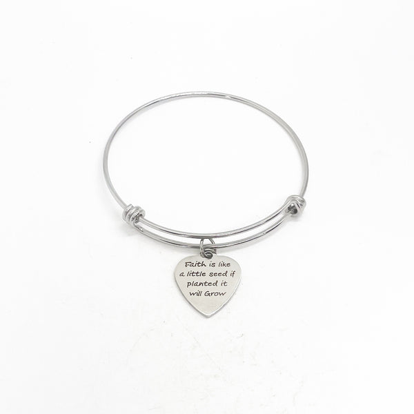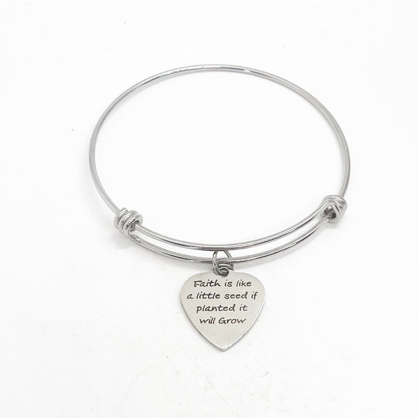 This is a beautiful bangle bracelet with a laser engraved stainless steel charm, with “Faith is like a little seed, if planted it will grow” on it.