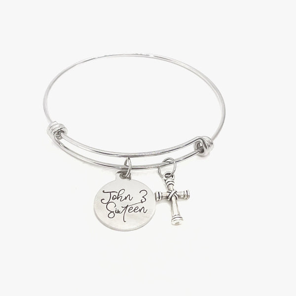 This is a beautiful bangle bracelet with a laser engraved stainless steel charm, with “John 3 Sixteen” on it and has a small cross charm.