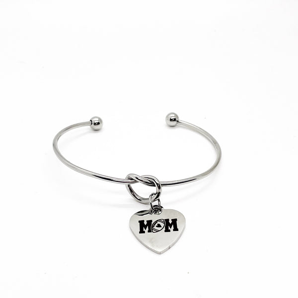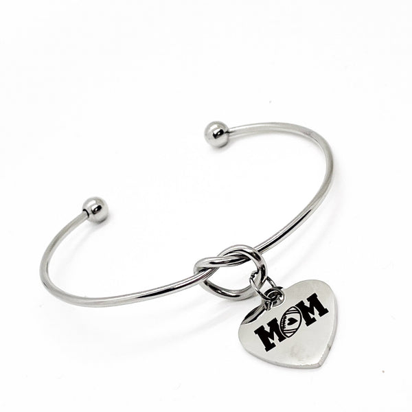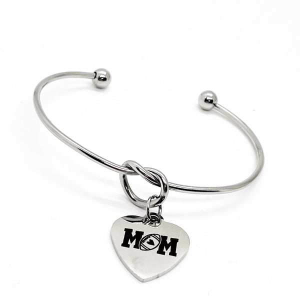 This is a beautiful knotted stainless steel cuff bracelet with an engraved charm with “Football Mom” on it.