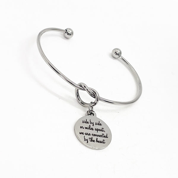This is a beautiful knotted stainless steel cuff bracelet with an engraved charm with the following on it: Side by side or miles apart we are connected by the heart