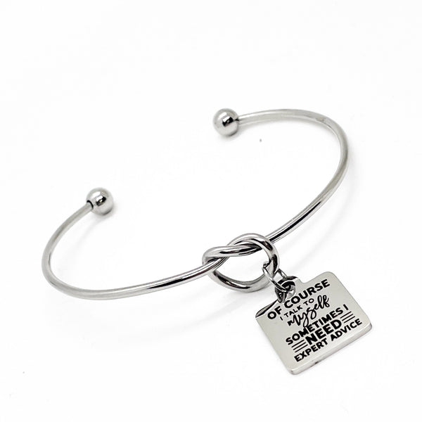 This is a beautiful knotted stainless steel cuff bracelet with an engraved charm with “Of course I talk to myself, sometimes I need expert advice” on it.