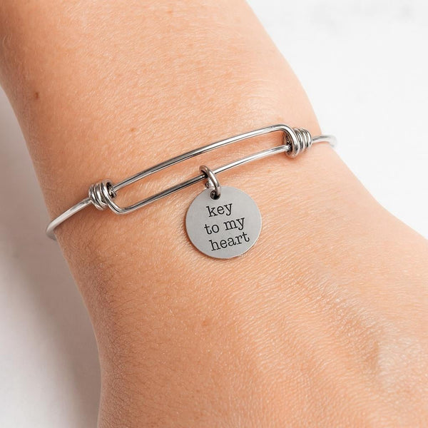 Express love and affection with this Key To My Heart bracelet. Featuring a minimalist stainless steel adjustable bangle and a round charm engraved with the heartfelt phrase key to my heart, this bracelet is a timeless symbol of romance. The 19mm polished charm adds a touch of shine, while the durable stainless steel construction ensures it will last for years. Perfect as a meaningful gift for anniversaries, Valentine’s Day, or simply to show someone special how much they mean to you.
