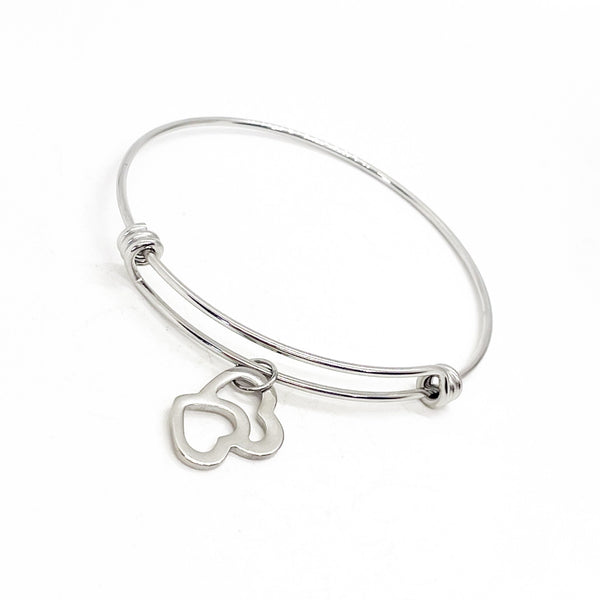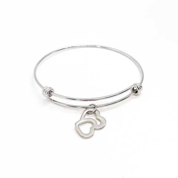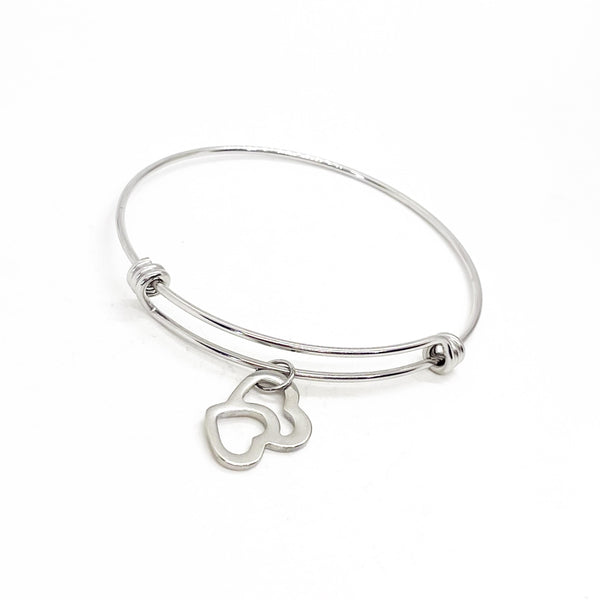 This is a beautiful bangle bracelet with two intertwined hearts on it.