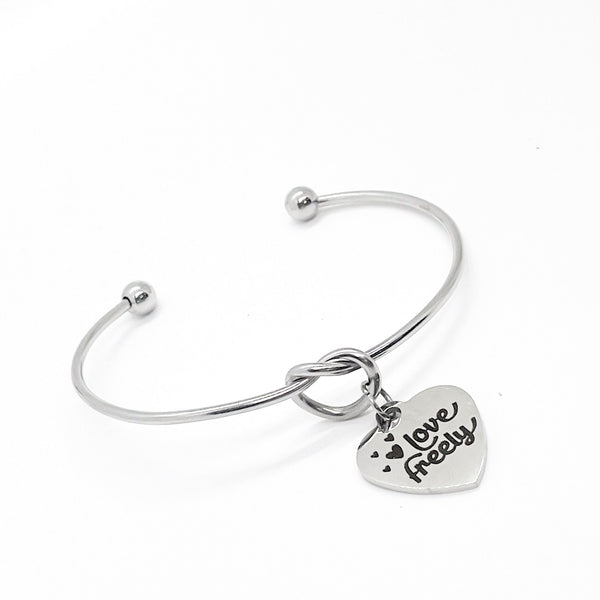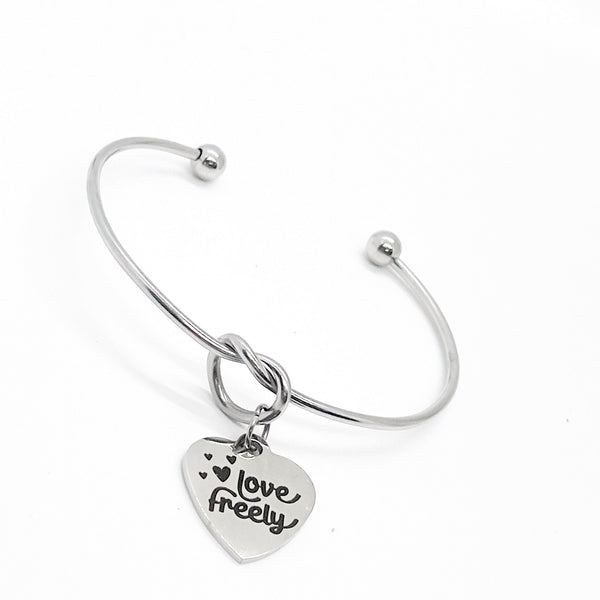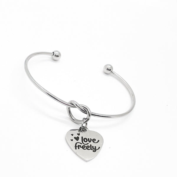 This is a beautiful knotted stainless steel cuff bracelet with an engraved charm with “Love freely” on it