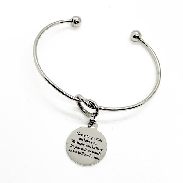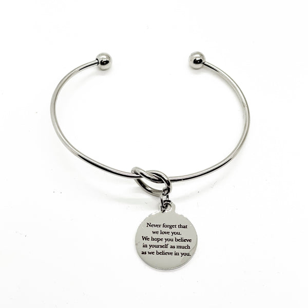 This is a beautiful knotted stainless steel cuff bracelet with an engraved charm with “Never forget that we love you. We hope you believe in yourself as much as we believe in you.” on it