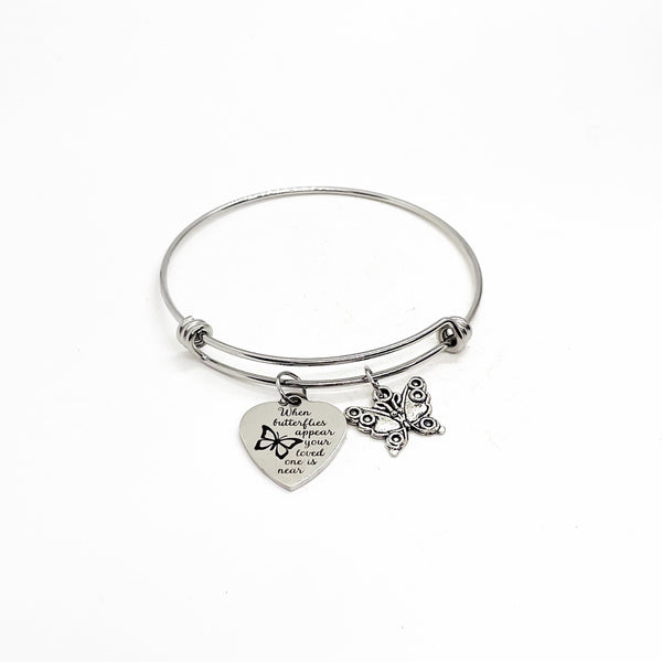 This is a beautiful bangle bracelet with a laser engraved stainless steel charm, with “When butterflies appear your loved one is near” with a small butterfly charm on it.