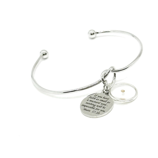 This is a beautiful knotted cuff bracelet with an engraved charm with the verse of Matthew 17:20 and a mustard seed charm to remind us that with the faith of a mustard seed we can move mountains. The charm measures approx. 3/4 inch across.