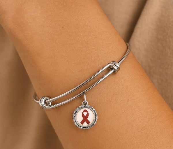 This is a beautiful bangle bracelet with a red ribbon charm on it.