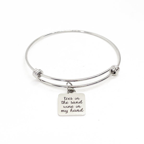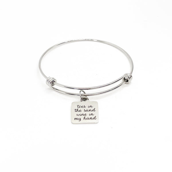 This is a beautiful bangle bracelet with a laser engraved stainless steel charm, with “toes in the sand, wine in my hand” on it.
