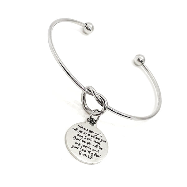 This is a beautiful knotted stainless steel cuff bracelet with an engraved charm with “Where you go I will go and where you stay I will stay. Your people will be my people and your God My God. Ruth 1:16” on it.