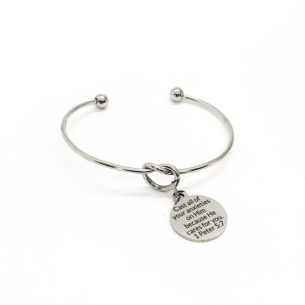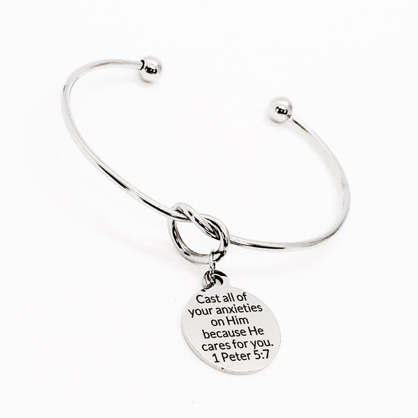 This is a beautiful knotted stainless steel cuff bracelet with an engraved charm with “Cast all of your anxieties on him” from 1 Peter 5:7 on it.