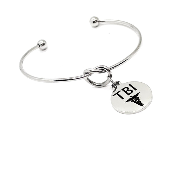 This is a beautiful knotted stainless steel cuff bracelet with an engraved charm with “TBI” on it