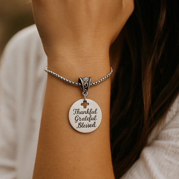 This elegant stainless steel bracelet from JKCE Designs features a beautifully engraved round charm that reads “Thankful Grateful Blessed.” Measuring approximately 25mm, the charm includes a delicate cross cut-out where it connects to the ornate bale, adding a meaningful touch of faith and gratitude. The bracelet itself is crafted from high-quality stainless steel with a rounded box chain, offering both durability and shine. Available in your choice of lengths, this timeless piece makes a perfect gift for birthdays, holidays, or as a daily reminder of thankfulness and faith.