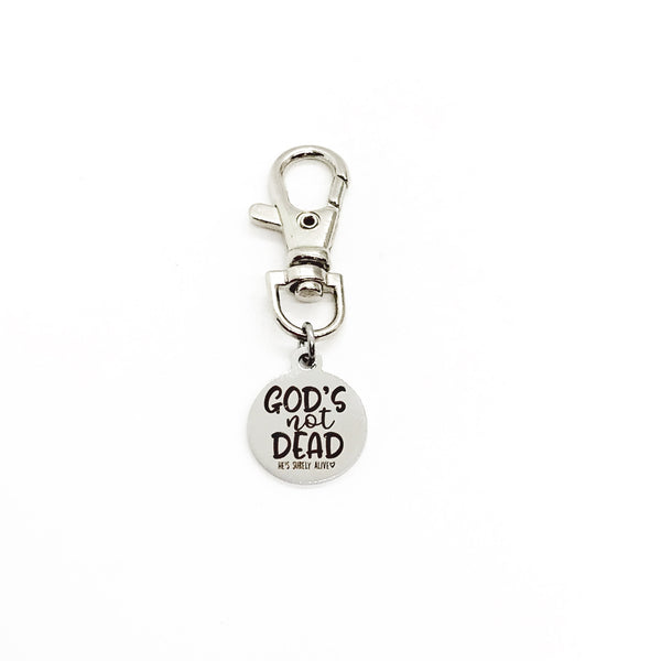 This is a great zipper pull or bag charm clip gift that would be a perfect gift for yourself or someone you love. It would also be a great charm to clip onto a tote, purse, sports bag, book bag or keychain. It has a stainless steel laser engraved charm with “God’s no dead, He’s surely alive” on it. The charm measures approx. 3/4 inch across.