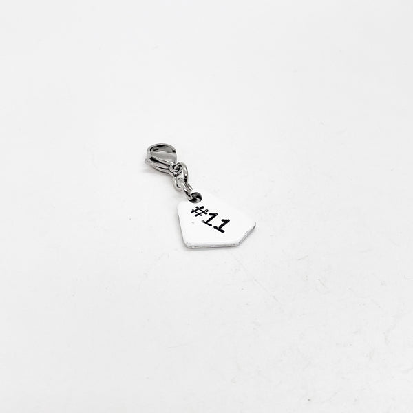 This is a great home plate zipper pull or bag charm clip. It would be a great charm to clip onto a sports bag, book bag or keychain. It can be personalized with your favorite player’s number. The charm measures approx. 1/2 inch.