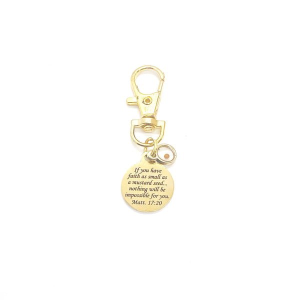 This is a great zipper pull or bag charm clip gift that would be a great faith gift. It would be a great charm to clip onto a tote, purse, sports bag, book bag or keychain. It has a stainless steel engraved charm with “If you have faith as small as a mustard seed… nothing will be impossible for you” from Matthew 17:20 on it.