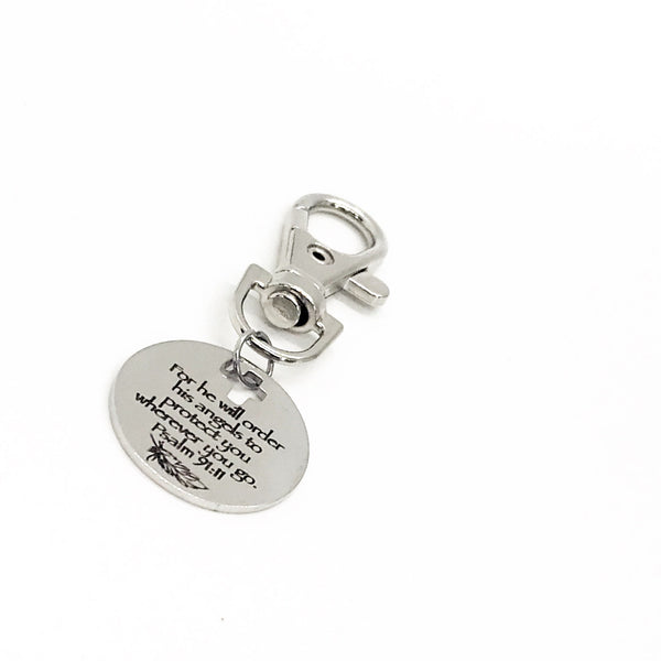 This is a great zipper pull or bag charm clip gift that would be a great gift. It would be a great charm to clip onto a tote, purse, sports bag, book bag or keychain. It has a stainless steel laser engraved charm with “For He will order his angels to protect you wherever you go” from Psalm 91:11 on it. The charm measures approx. 1 inch.