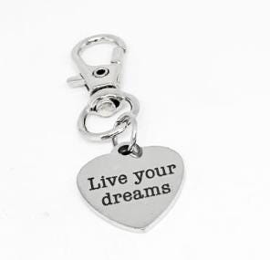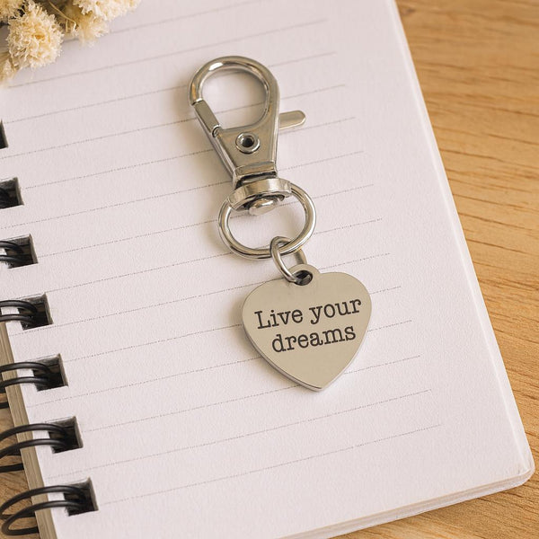 Carry inspiration with you wherever you go with this Live Your Dreams engraved stainless steel heart charm.