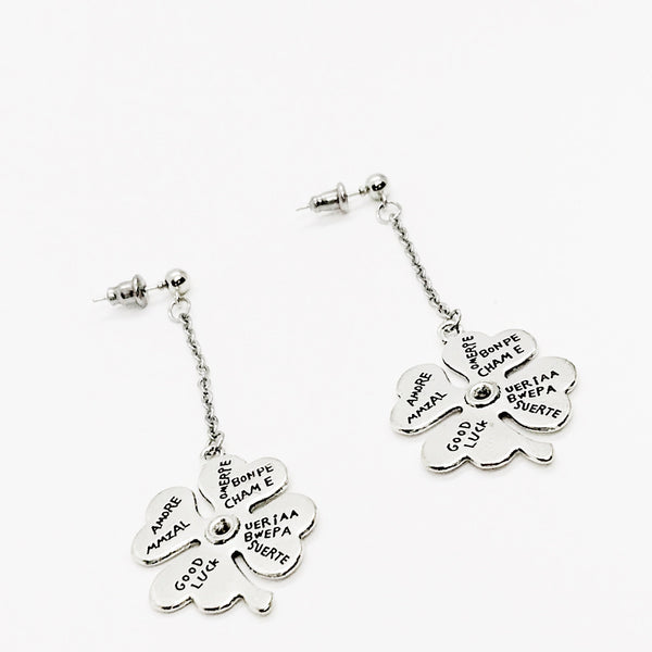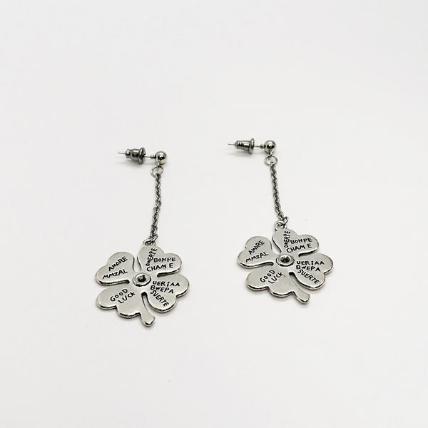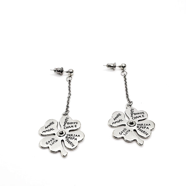 This is a unique and great set of statement earrings. The drop is a silvertone metal and are placed on stainless steel posts. The four leaf clover charm measures approx. 1 inch. There are multiple drop length options.
