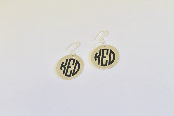 This is a unique set of personalized monogrammed earrings. They are made with transfer initials. The drop is a silvertone metal and are place on sterling silver ear wires. The pendant piece measures just over 1 inch wide.