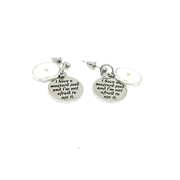 This is a unique and great set of statement earrings. They have the quote of "I have a mustard seed and I'm not afraid to use it" and are made to represent mustard seed faith as described in Matthew 17:20. These would be great earrings to remind yourself or someone that you love that you can move mountains with faith as small as a mustard seed. The charm measures approx. 3/4 inch across. The earrings include a card with the scripture of Matthew 17:20.
