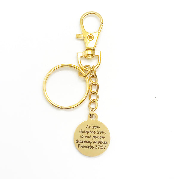 This is a great goldtone keychain gift . The keyring can be clipped onto your bag to make it easy to access without digging to the bottom of the bag. It has a goldplated stainless steel charm with “As iron sharpens iron so one person sharpens another” from Proverbs 27:17 on it.
