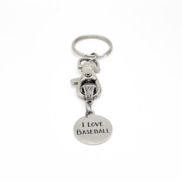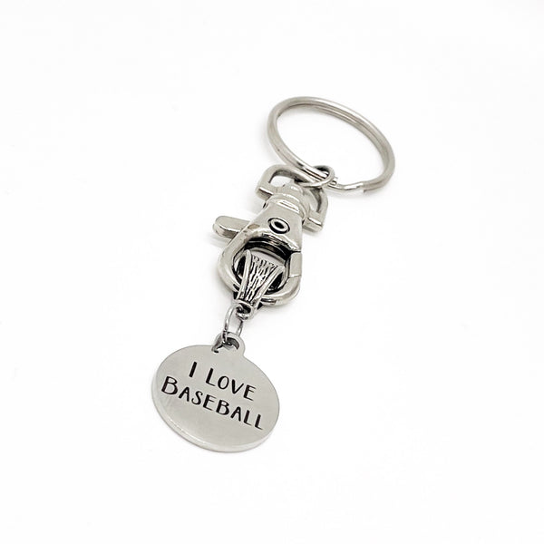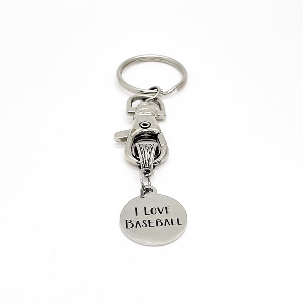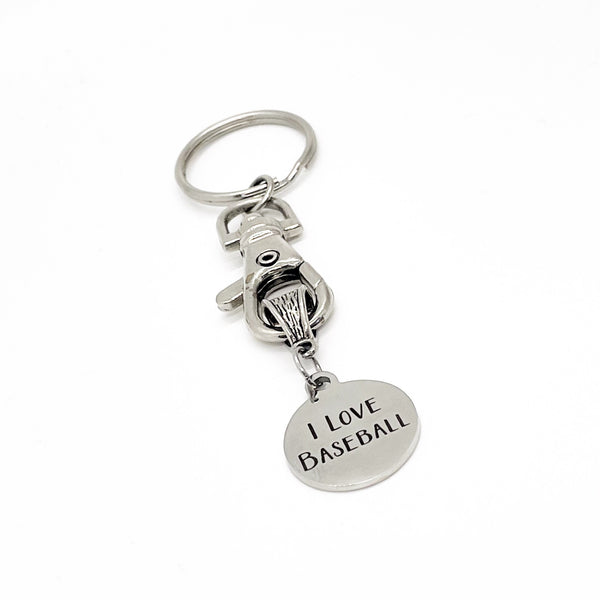 This keychain gift has a stainless steel laser engraved charm with “I love baseball” on it. The charm measures approx. 3/4 inch across.