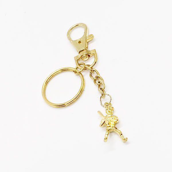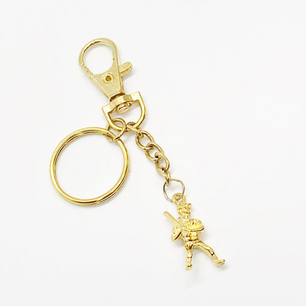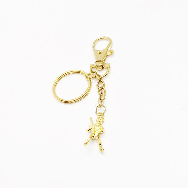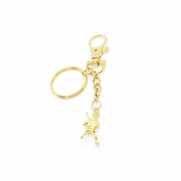 This is a great goldtone keychain gift . The keyring can be clipped onto your bag to make it easy to access without digging to the bottom of the bag. It has a Goldtone baseball player charm on it.