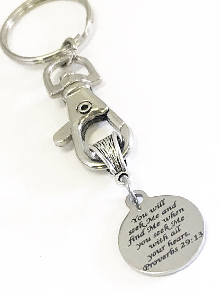 This would make a great Bible Verse keychain gift. It has a stainless steel laser engraved charm with "You will seek Me and find Me when you seek Me with all your heart" from Proverbs 29:13 on it.