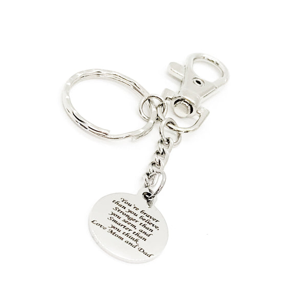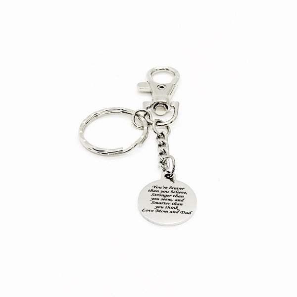 This is a great keychain gift . The keyring can be clipped onto your bag to make it easy to access without digging to the bottom of the bag. It has a stainless steel laser engraved charm with “ You’re Braver than you believe, Stronger than you seem and Smarter than you think. Love Mom and Dad” on it. The charm measures approx. 3/4 inch across.