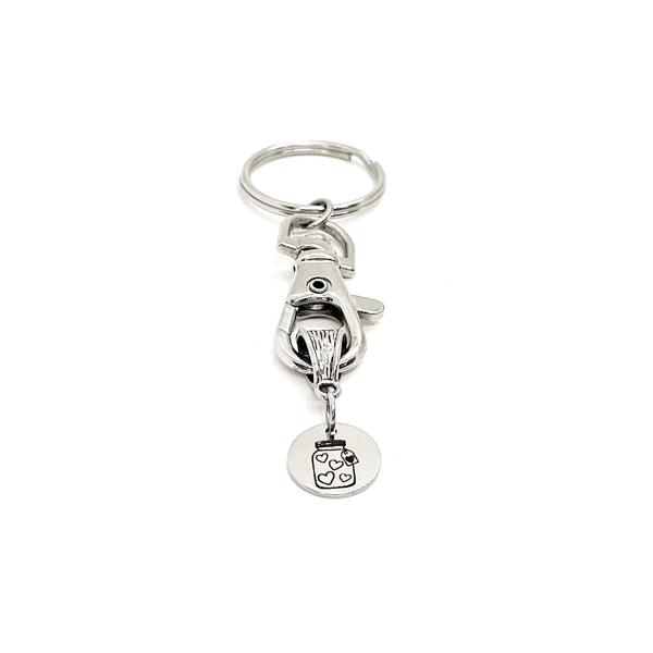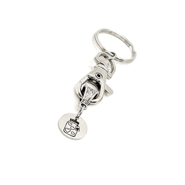 This keychain includes a stainless steel laser engraved charm with a canning jar with hearts in it.
