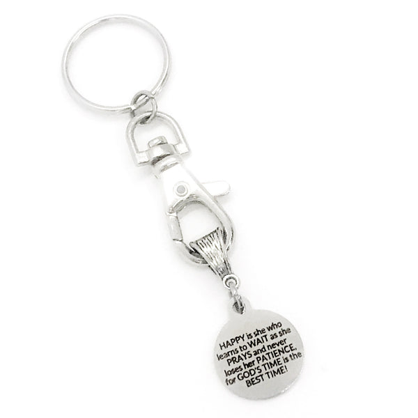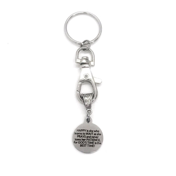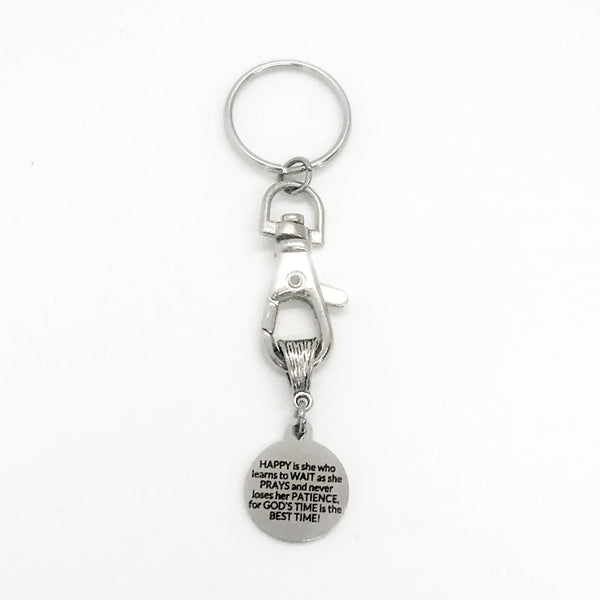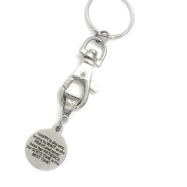 This keychain would make a great Christian woman keychain gift. It has a stainless steel laser engraved charm with “HAPPY is she who learns to WAIT as she PRAYS and never loses her PATIENCE, for GOD’S TIME is the BEST TIME!” on it.