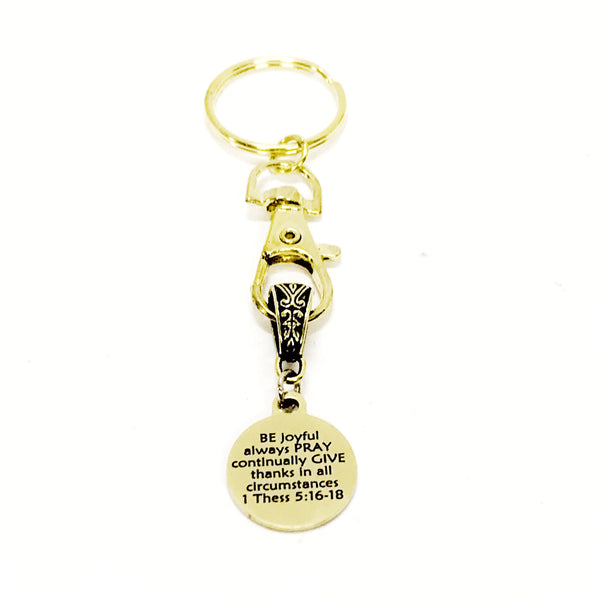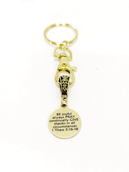 This is a great keychain that has a goldtone stainless steel laser engraved charm which says, "Be joyful, always pray, continuously give thanks in all circumstances" from 1st Thessalonians 5:16-18 on it.