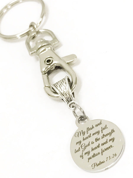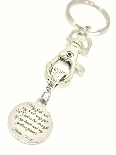 This keychain includes a stainless steel laser engraved charm that has the Bible verse of Psalms 73:26, "My flesh and my heart may fail, but God is the strength of my heart and my portion forever", on it.