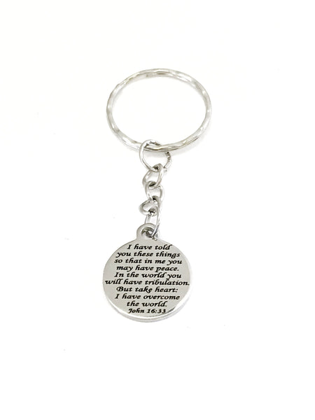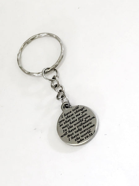 This is a great Christian keychain gift to encourage to have peace in the Lord because He has overcome the world. It has a stainless steel laser engraved charm with this verse from John 16:33 on it: