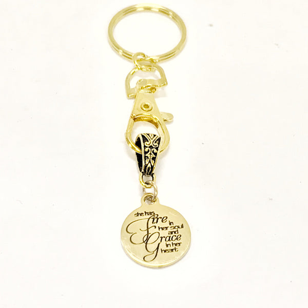 This is a great keychain that has a goldtone stainless steel laser engraved charm which says, "She has fire in her soul and grace in her heart" on it.