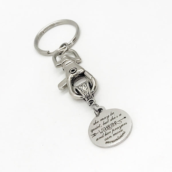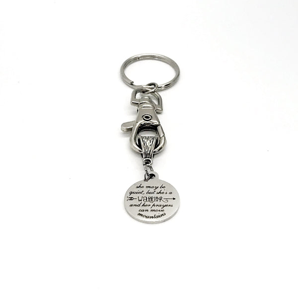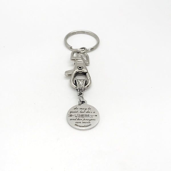 This keychain gift would make a great Christian woman gift. It has a stainless steel laser engraved charm with “she may be quiet, but she’s a warrior and her prayers can move mountains” on it.