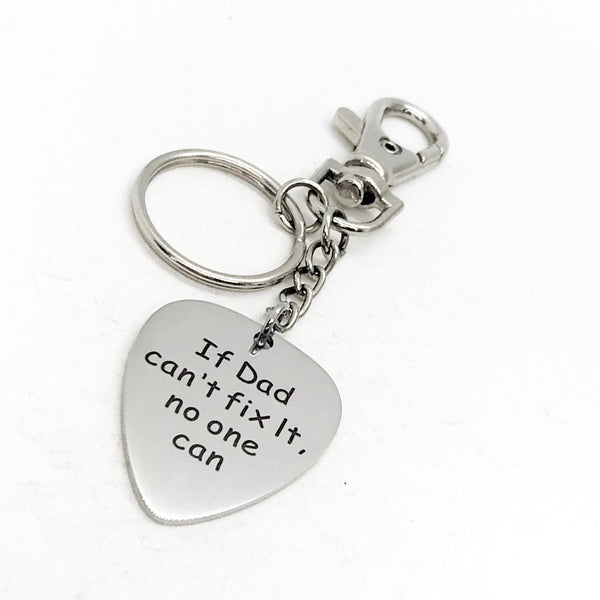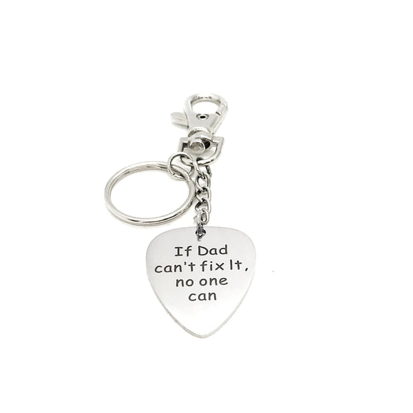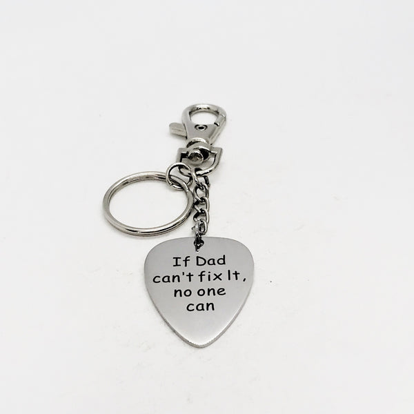 This is a great keychain gift . The keyring can be clipped onto your bag to make it easy to access without digging to the bottom of the bag. It has a stainless steel laser engraved charm with “If Dad can’t fix it no one can” on it.