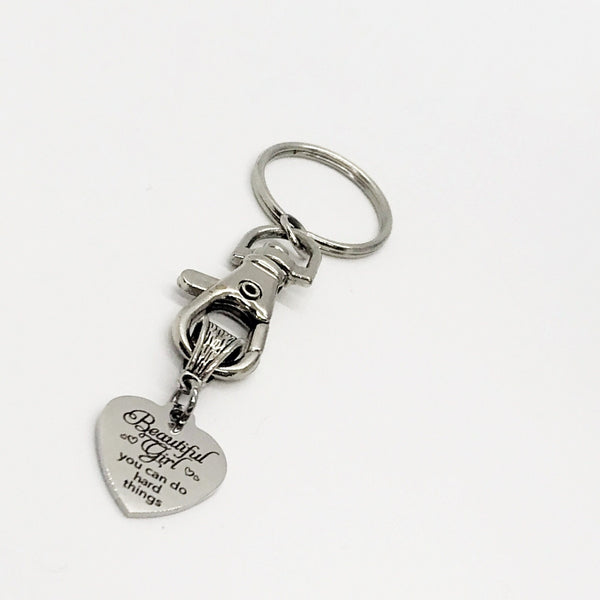 This keychain would make a great gift. It has a stainless steel laser engraved charm with “Beautiful Girl, you can do hard things” on it.
