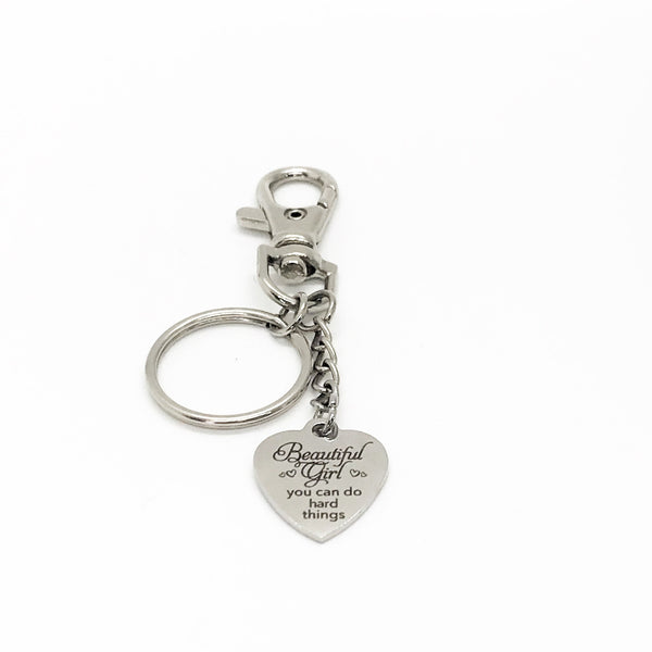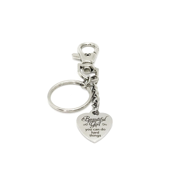 This is a great keychain gift . The keyring can be clipped onto your bag to make it easy to access without digging to the bottom of the bag. It has a stainless steel laser engraved charm with “Beautiful Girl, you can do hard things” on it.