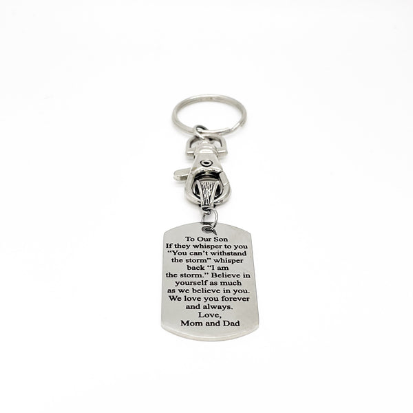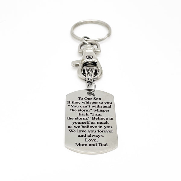 This keychain gift has a stainless steel laser engraved charm with the following on it: