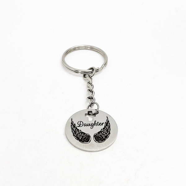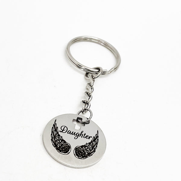 This keychain has a stainless steel laser engraved charm with “Daughter" and angel wings on it. The charm measures approx. 1 inch.