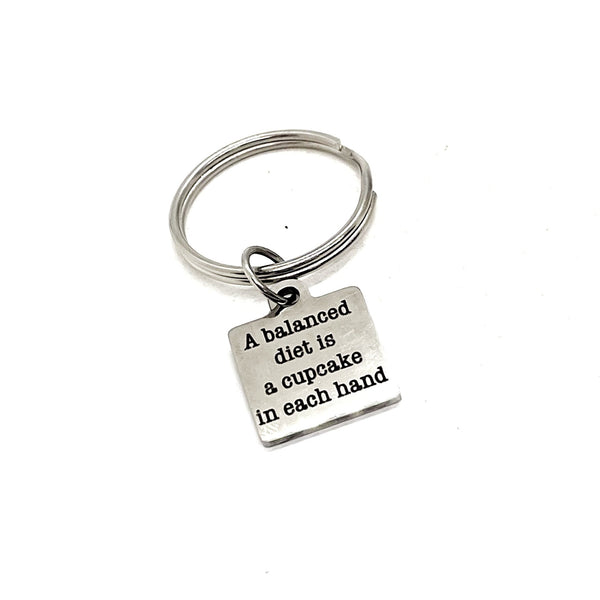 This is a wonderful keychain gift! It has a stainless steel laser engraved charm with “A balanced diet is a cupcake in each hand” on it. The charm measures approx. 1/2 inch across.