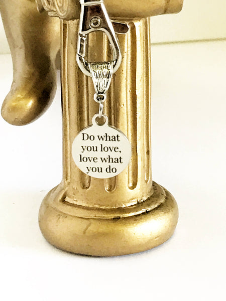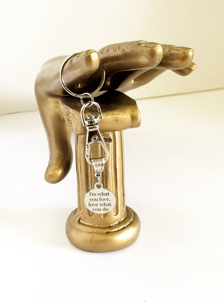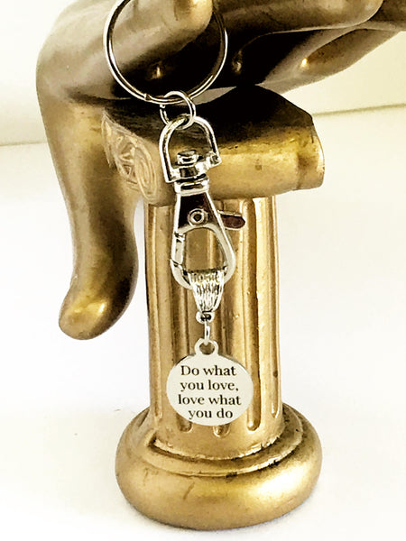 This keychain includes a stainless steel laser engraved charm that has "Do What You Love, Love What You Do" on it.