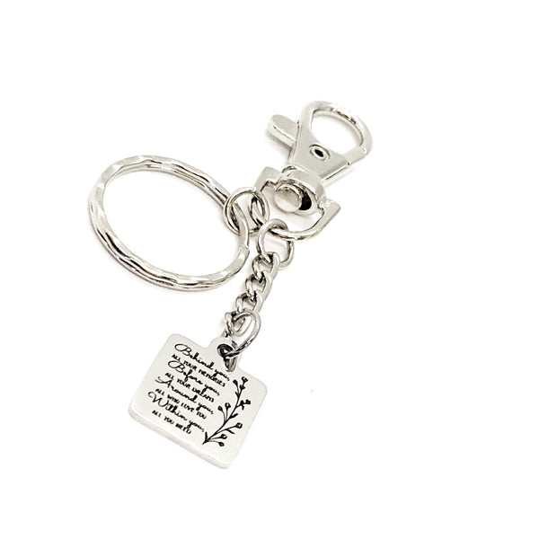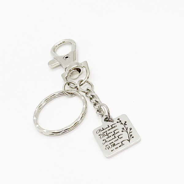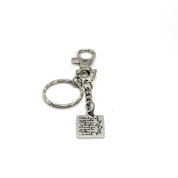 This is a great keychain gift . The keyring can be clipped onto your bag to make it easy to access without digging to the bottom of the bag. It has a stainless steel laser engraved charm with “Behind you all your memories, Before you all your dreams, Around you all who love you, Within you all you need” on it. The charm measures approx. 3/4 inch across.