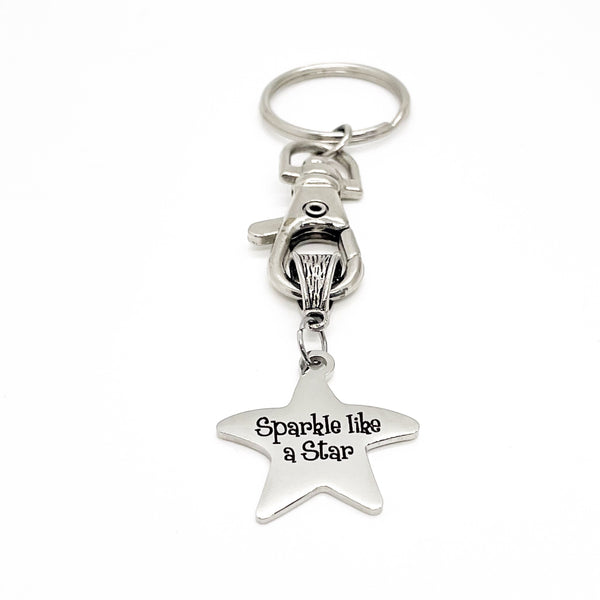 This keychain gift has a stainless steel laser engraved charm with “Sparkle Like A Star” on it. The charm measures approx. 1 inch across.
