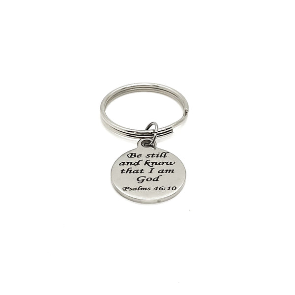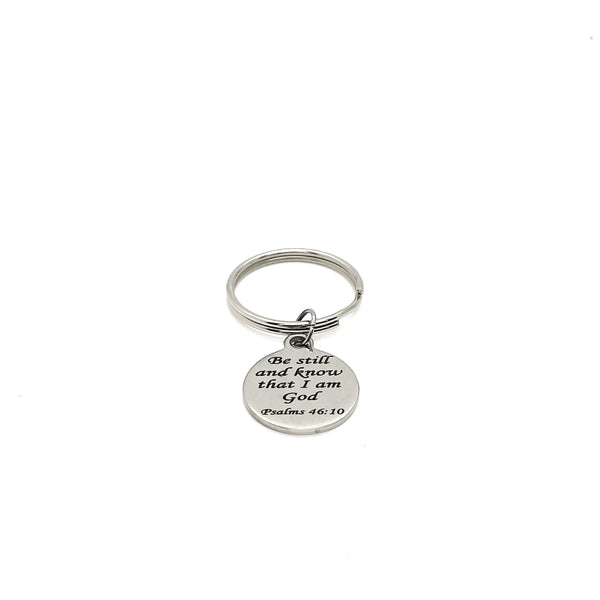 This is a wonderful keychain gift! It has a stainless steel engraved charm with “Be still and know that I am God” from Psalm 46:10 on it. The charm measures approx. 3/4 inch across.
