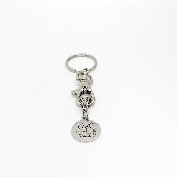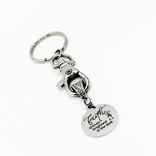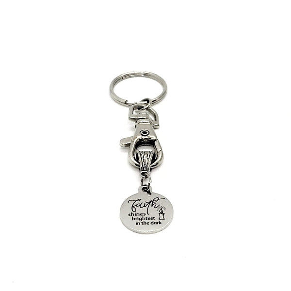 This keychain would make a great gift. It has a stainless steel laser engraved charm with “Faith shines brightest in the dark” on it.