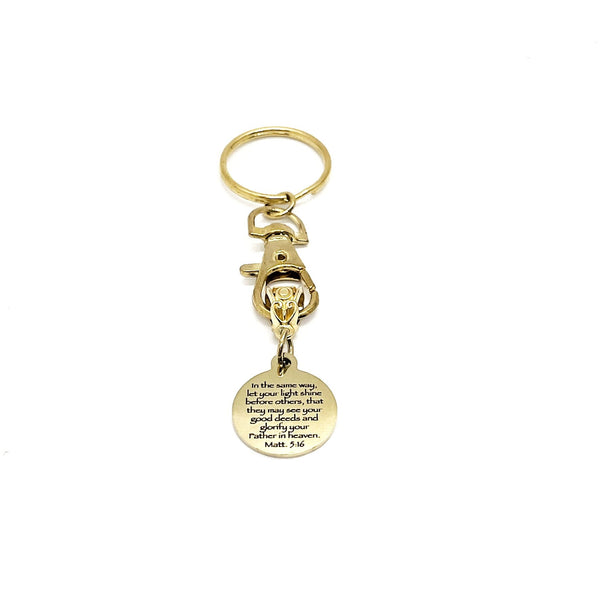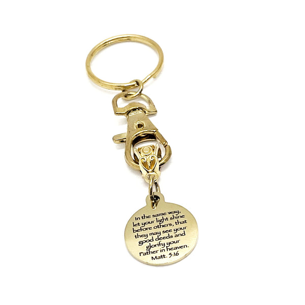 This keychain would make a great gift to remind someone that no matter who is against us, if God is on our side, that is all that matters. It has a gold-plated stainless steel laser engraved charm with “In the same way, let your light shine before others, that they may see your good deeds and glorify your Father in heaven” from Matthew 5:16 on it.